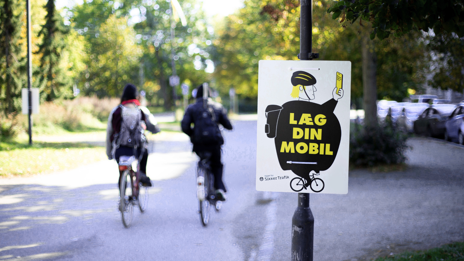 Vær opmærksom når du cykler. Gem mobilen væk. Randers Kommune deltager i Rådet for Sikker Trafiks nye cykelkampagne og sætter plakater i vejsiden for at gøre opmærksom på dette.